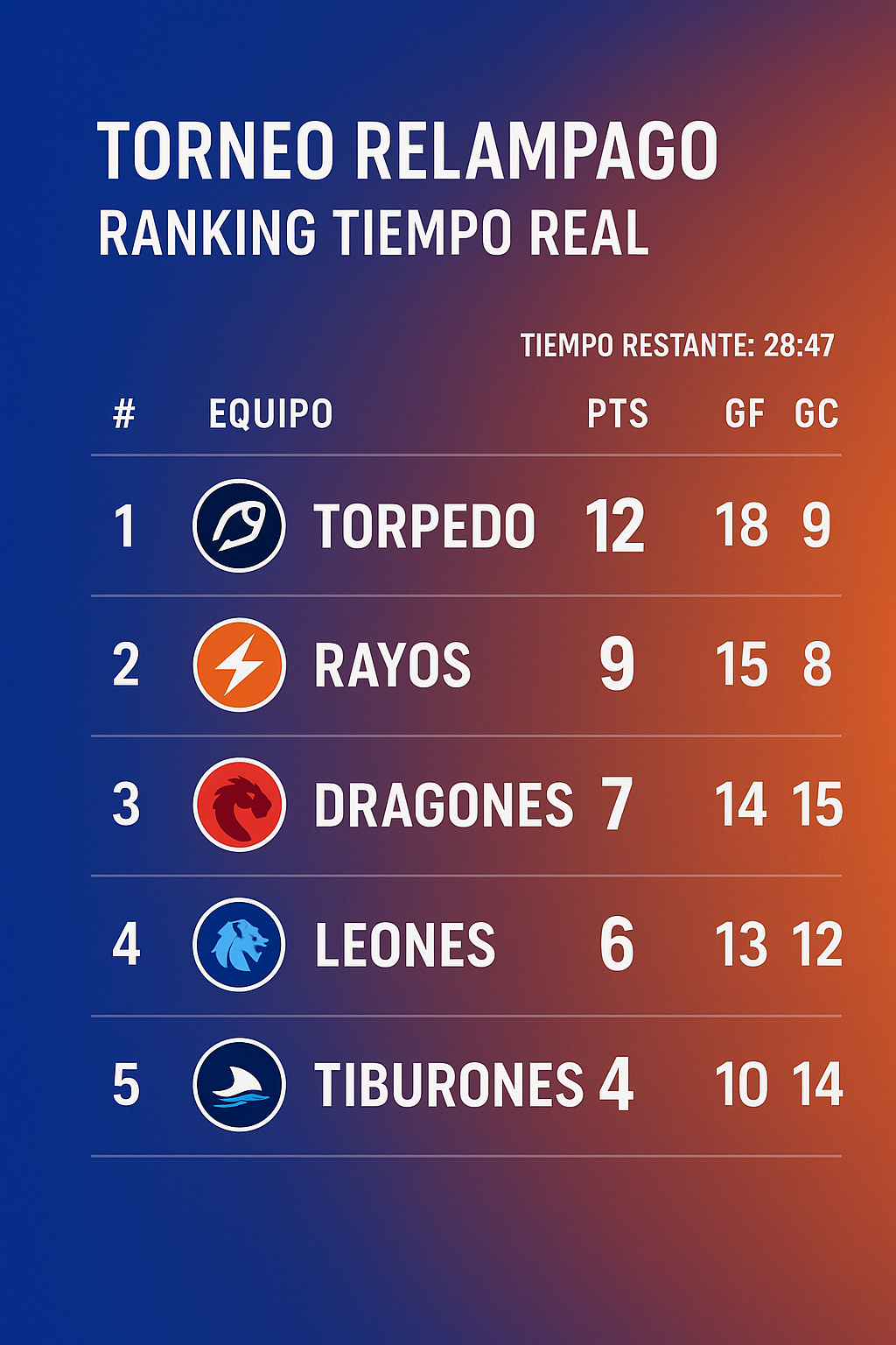 Nuestro ranking dinámico te permite vivir el torneo minuto a minuto, comparar equipos, analizar su progreso y sentir la emoción de avanzar en la tabla. Aquí, cada jugada cuenta y cada punto puede cambiar la historia del Torneo Relámpago.